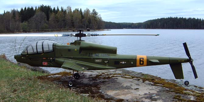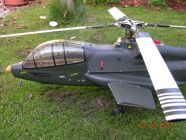 Introduced at the 1980 Nürnberg show and fitted with the 'System 80' mechanics. Near scale for '60' size engines and supplied with fixed landing gear though as an option a set of pneumatic retractable legs could be fitted. Had an unusual method of starting by an extended shaft from the engine protruding through the front of the helicopter with a small spinner fitted that allowed the use of a 'normal' aeroplane type starter.