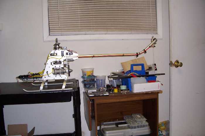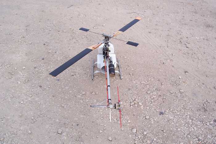 Of note is that the control system incorporated a rocking servo mount, not much unusual in that however, the tail servo was also on this mount thereby giving collective / tail rotor mixing. Another advanced feature was the counterbalance weight fitted to the tail blade holders which tended to reduce the loading on the servo by countering the force which tended to return the blades to neutral. Additionally there is no overrunning clutch (bearing) in the drive train to allow for autorotation landings even though the helicopter can do auto's. The centre of the driving hub of the clutch is square and the shoes are held against this square with a coil spring encircling the outer perimeter of the two, semicircular aluminium, free-floating shoes. The spring force is set to obviously hold the shoes away from the clutch bell's lining at idle and is also strong enough to allow an easy release at a rather high speed. So, under load the angle of the square causes a wedging action against the inner edge of the shoes and jambs the shoes toward the clutch drum lining. Pull power off the engine and this wedging action goes away allowing the bell to spin free; result autorotation.... Also, the tail rotor stays driven with the main rotor allowing direction control on the way down.